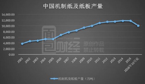本輪的價格飆漲很有可能扭轉過去幾年造紙行的疲軟態勢。統計數據顯示:2011年之后,中國機制紙與紙板產量的增幅持續放緩,并在2015年陷入了負增長。今年前10個月,產量已經超過1億噸,同比增長3.05%。盡管增幅不算高,但已經扭轉了負增長的局面。考慮到近期旺盛的需求,全年增長很有可能創下近五年的新高。下圖為面包財經根據國家統計局繪制的中國機制紙及紙板產量:
