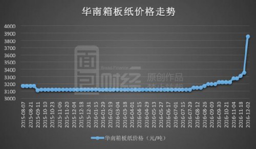 據統計,截至2016年12月2號,華南箱板紙價格為3858元/噸;與今年7月相比,增幅高達23.61%。下圖為面包財經根據Wind數據繪制的華南箱板紙價格走勢: