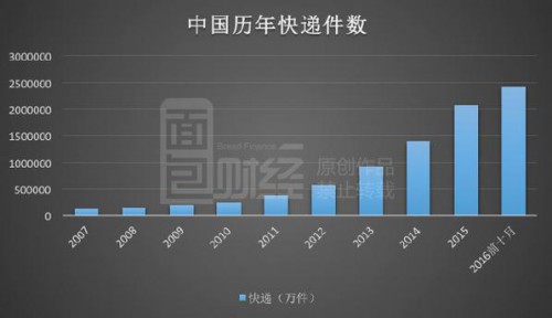 在去產能的同時,對紙張的需求正迅速增加,尤其是電商銷售收入飆漲帶來的快遞量攀升,刺激了包裝紙的需求。據國家統計局數據,截至今年10月底,中國快遞量已達到241.23億件,與去年同期的156.42億相比,大漲了54.26%。下圖為面包財經根據國家統計局數據繪制的中國歷年快遞件數: