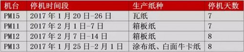 相比于馬鞍山山鷹紙業,浙江海鹽山鷹停機時間相對較晚。海鹽山鷹紙業將從2017年1月20日(農歷臘月二十三)開始停機檢修,涉及瓦楞紙、相伴紙、涂布紙、白面???類紙種。各機臺停機時長在7-8天,該基地最晚于2017年2月14日(農歷正月十八)恢復生產。