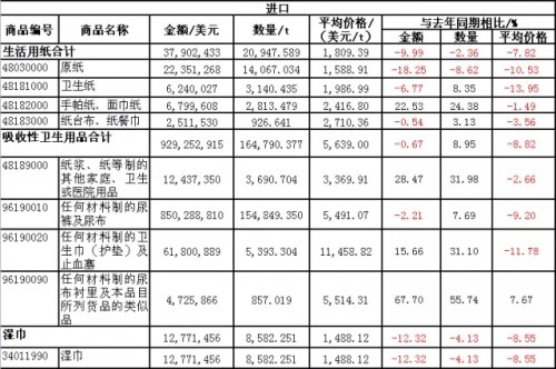 吸收性衛生用品的總進口量增幅和紙尿褲的進口量增幅都下降為一位數(2015年同期為高兩位數),且進口額出現負增長,只有女性衛生用品的進口實現兩位數增長,但增長率大幅下降(2015年同期為三位數)。
