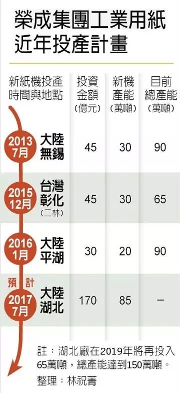 目前,榮成集團在臺灣與大陸華東地區工紙市場占有率皆居市場前三,待2019年,湖北榮成項目全部完工量產后,榮成集團在中國的工紙總產能將達335萬噸,兩岸工紙產能將達400萬噸,有機會挑戰全中國第3大寶座。