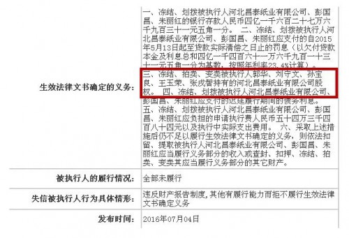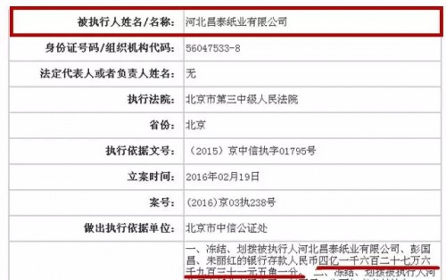 該起案件于今年2月19日在北京市第三中級人民法院立案,因“有履行能力而拒不履行生效法律文書確定義務”,2016年7月4日法院做出凍結、劃撥被執行人河北昌泰紙業、彭國昌、朱麗紅約4.1億銀行存款的處理結果。