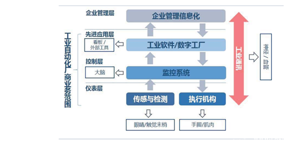 傳統(tǒng)的工業(yè)管控系統(tǒng)分為四個層級:檢測執(zhí)行層和控制執(zhí)行層通過傳感——控制——執(zhí)行,形成閉環(huán)的回;先進應(yīng)用層為控制層提供優(yōu)化;企業(yè)管理層是ERP等管理信息系統(tǒng);工業(yè)通訊貫穿始終。當前在“互聯(lián)網(wǎng)+”的趨勢下,催生出了一系列和工業(yè)相關(guān)的新興應(yīng)用,可稱為協(xié)同層。
