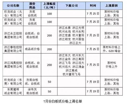 東莞玖龍從7月19日起所有品牌灰底白板紙、白底白板紙價格上調(diào)50元/噸,提價理由受原材料及其他綜合成本不斷上漲影響。