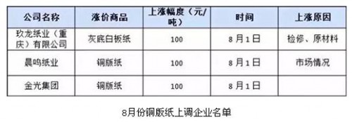 重慶玖龍7月25日發(fā)出通知,從8月1日起涂布灰底白板紙價格上調(diào)100元/噸,提價理由受設(shè)備規(guī)劃性檢修、原材料及其他綜合成本不斷上漲的影響。