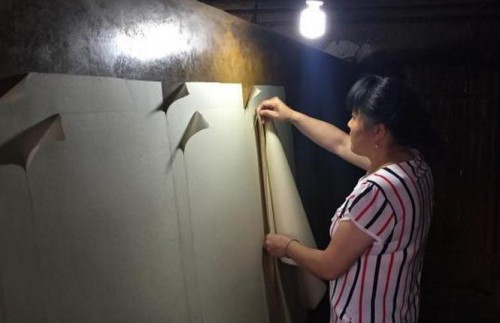 黃隆根的制作工坊在自家兩層土樓內(nèi),水不停地從紙槽房底流出,只見(jiàn)黃隆根將簾架往槽內(nèi)一舀、一端,再往前一挑、往后一送,紙漿便覆滿竹簾。撈出落簾,輕輕一揭,紙平攤在墊板上,越壘越厚如同一塊米豆腐。一旁的焙紙房,紙被一張張貼在斜墻上,室溫常年保持在四十?dāng)z氏度。