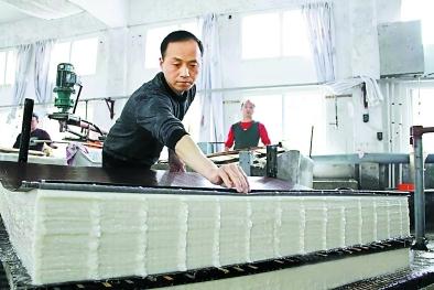 撈紙工人、全國勞動模范周東紅端著長方形的細密、工整的竹簾床,側著往紙漿槽中浸下,抬起簾子,水從竹簾縫中滲出,做紙的纖維則平鋪在竹簾上,形成薄薄的、棉絮狀的一張濕潤的宣紙。