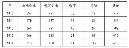2015年專項印刷(印前制版、印后裝訂)72家,比上年減少10家;其它印刷企業527家,比上年減少26家。