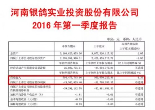 銀鴿投資2016年第一季度報(bào)告亦顯示,公司營收約5.94億元,歸屬上市公司股東的凈利潤約-4350萬元,虧損較大!