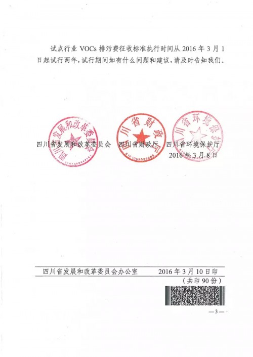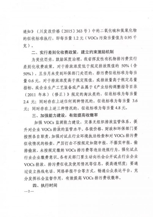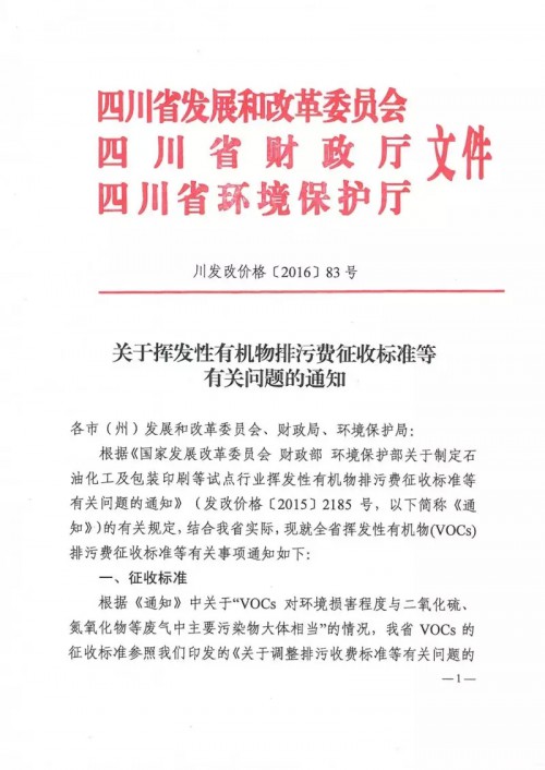 《四川省發展和改革委員會 四川省財政廳四川省環境保護廳關于揮發性有機物排污費征收標準等有關問題的通知》(川發改價格〔2016〕83號)