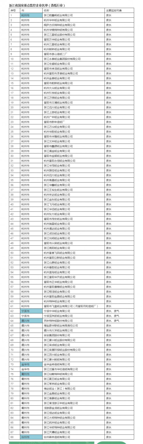 小編從杭州市環保局獲悉,2016版國家重點監控污染企業名單(第一批)發布。據不完全統計,名單中共涉及88家造紙企業。其中,杭州市61家,衢州市13家,嘉興市9家,寧波市2家,金華市2家,臺州市1家。