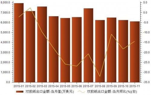 2015年11月我國雙膠紙出口金額為6,124.05萬美元,同比下降14.43%。