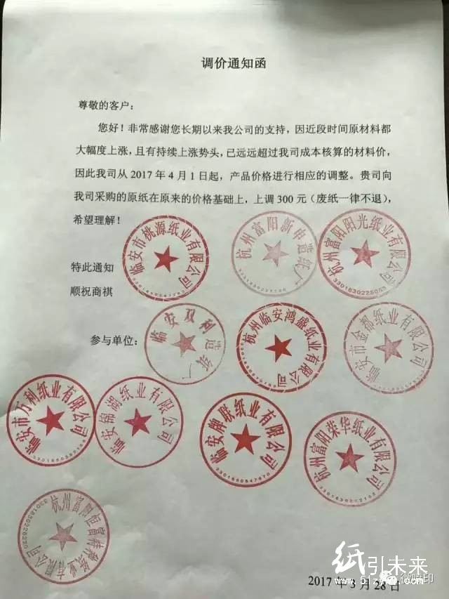 紙引未來訊據微信公眾號“微噴印”的消息,3月28日,杭州市11家造紙及紙制品企業聯合發出調價通知函:自2017年4月1日起,產品噸紙價格上調300元(廢紙一律不退)。