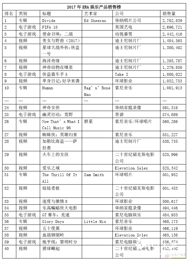 ERA年鑒還包括了2017年ERA娛樂產品銷售榜。ERA娛樂產品銷售榜結合了音樂、視頻和游戲的數字及實物銷售數據。