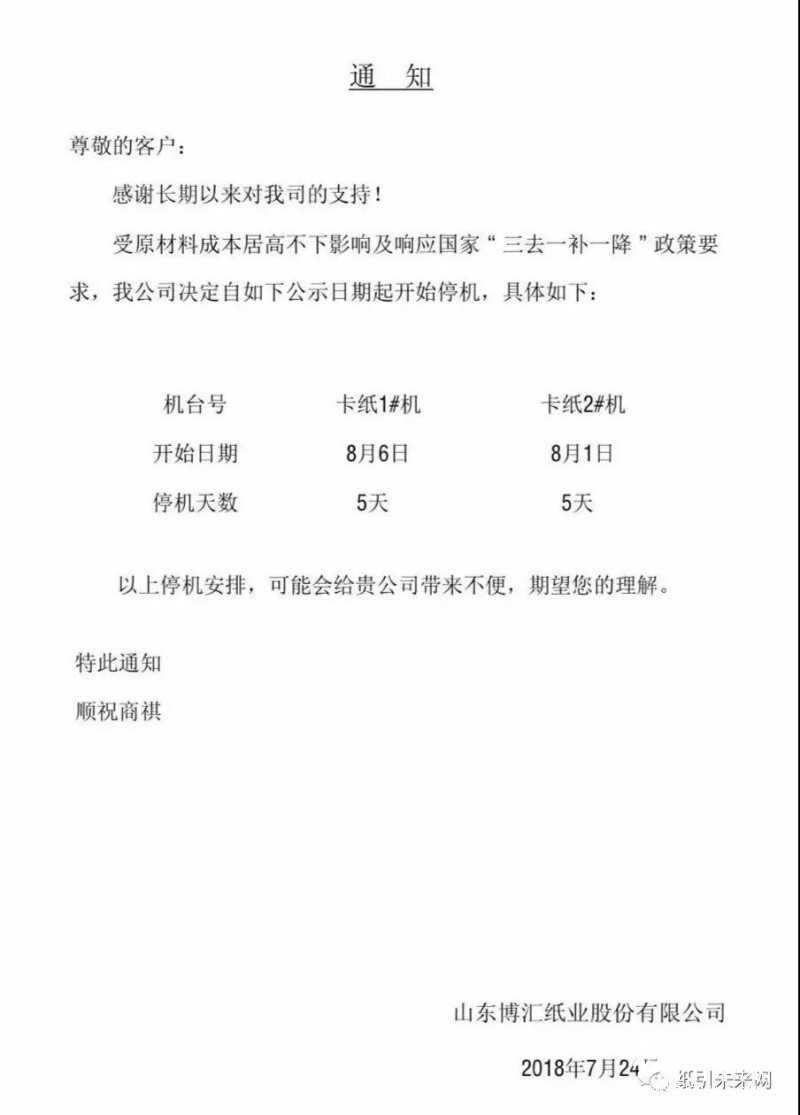 山東博匯紙業(yè):受原材料成本居高不下影響及響應(yīng)國(guó)家“三去一補(bǔ)一降”政策要求,卡紙1#機(jī)自8月6日起停機(jī)5天;卡紙2#機(jī)8月1日起停機(jī)5天。