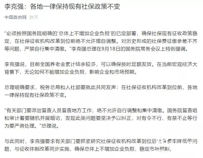 “必須按照國務院明確的‘總體上不增加企業負擔’的已定部署,確保社保現有征收政策穩定,在社保征收機構改革到位前絕不允許擅自調整。對歷史形成的社保費征繳參差不齊等問題,嚴禁自行集中清繳。”李克強總理在9月18日的國務院常務會議上特別強調。