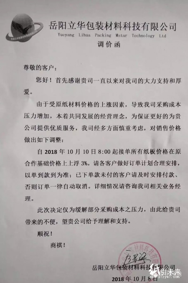 岳陽市立華包裝材料科技有限公司:自2018年10月10日接單起,所有紙板價格在原合作基礎上上浮3%。