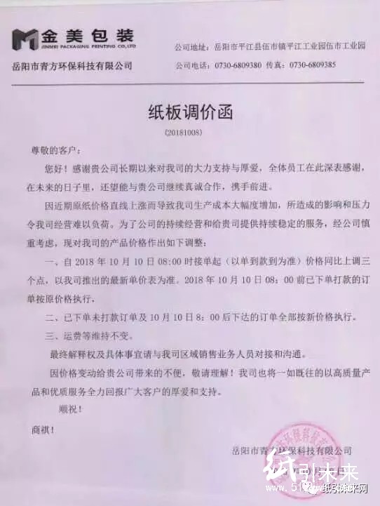 湖南龍發包裝有限公司:自2018年10月9日17:30接單起(以單到款到為準),所有紙板在現價格的基礎上上調3個點。