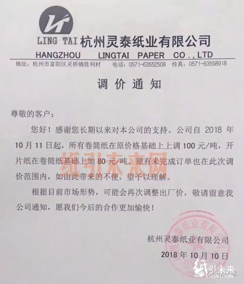 杭州靈泰紙業有限公司:自2018年10月11日起,所有卷筒紙在原價格基礎上上調100元/噸,開片紙在卷筒紙基礎上加80元/噸。