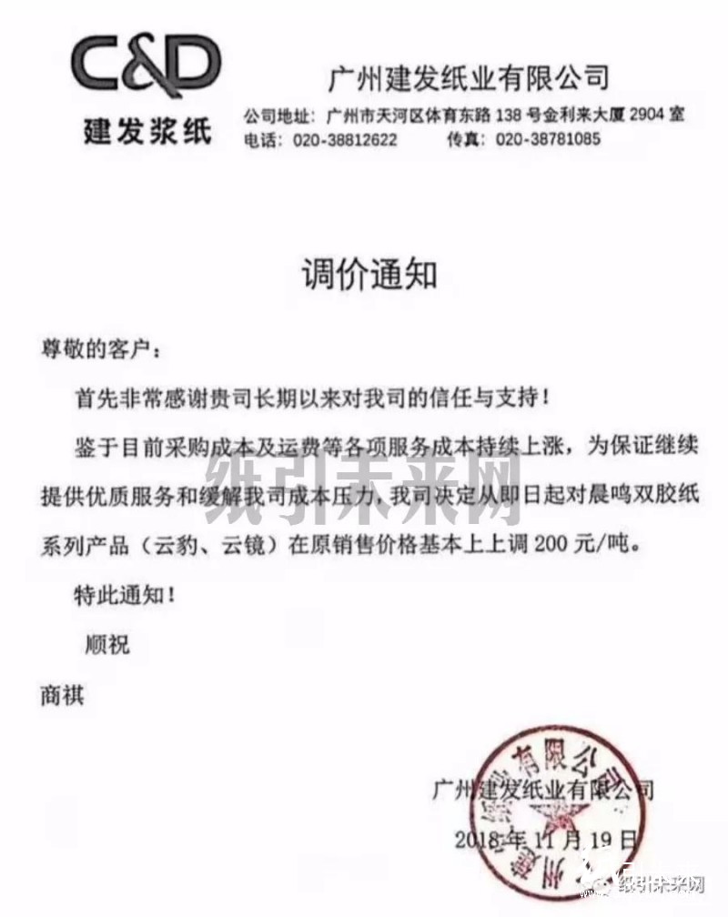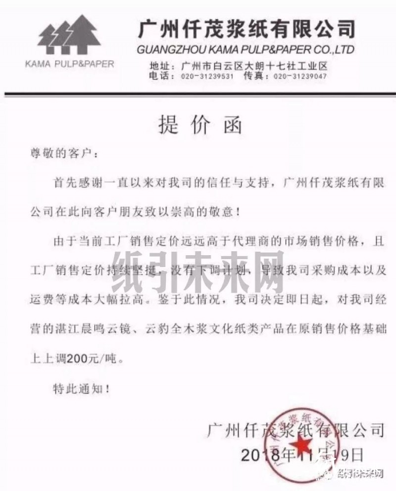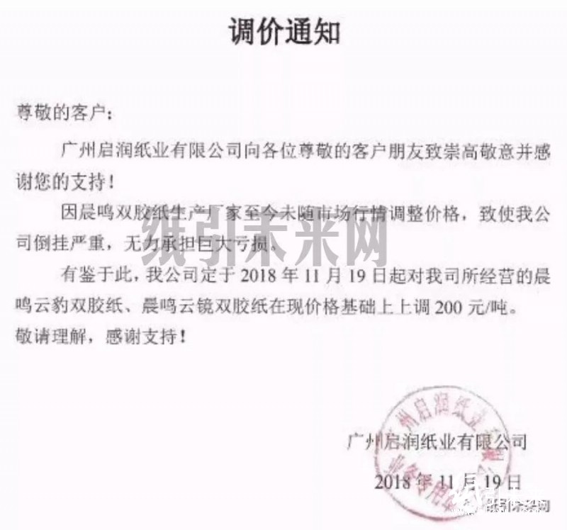 廣州啟潤紙業(yè)有限公司:因晨鳴雙膠紙生產(chǎn)廠家至今未隨市場行情調(diào)整價(jià)格,致使我司倒掛嚴(yán)重,11月19日起對我司所經(jīng)營的晨鳴云豹雙膠紙、晨鳴云鏡雙膠紙?jiān)诂F(xiàn)價(jià)格基礎(chǔ)上上調(diào)200元/噸。