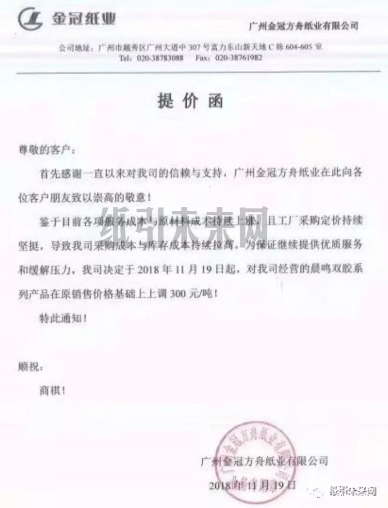 廣州金冠方舟紙業(yè)有限公司:鑒于目前各項(xiàng)服務(wù)成本與原材料成本持續(xù)上漲,且工廠采購定價(jià)持續(xù)堅(jiān)挺,我司決定11月19日起,對我司經(jīng)營的晨鳴雙膠系列產(chǎn)品在原銷售價(jià)基礎(chǔ)上上調(diào)300元/噸。