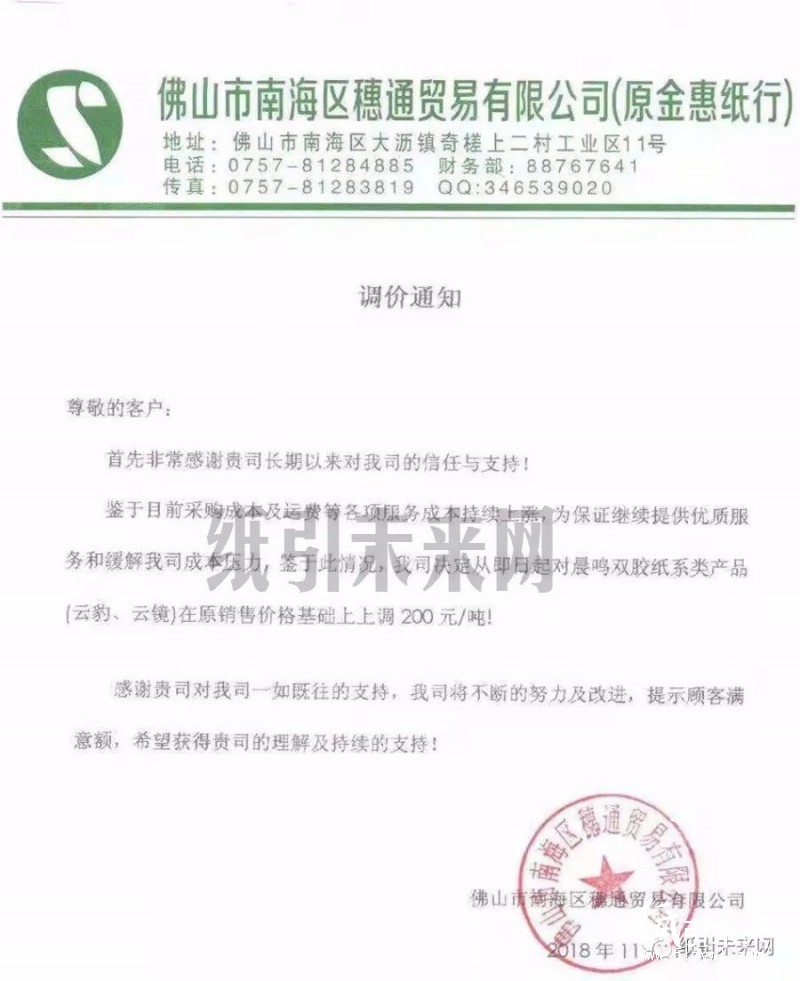 佛山市南海區(qū)穗通貿(mào)易有限公司(原金惠紙行):鑒于目前采購成本及運(yùn)費(fèi)等各項(xiàng)服務(wù)成本持續(xù)上漲,決定從即日起對晨鳴雙膠紙系類產(chǎn)品啊(云豹、云鏡)在原銷售價(jià)格基礎(chǔ)上上調(diào)200元/噸。