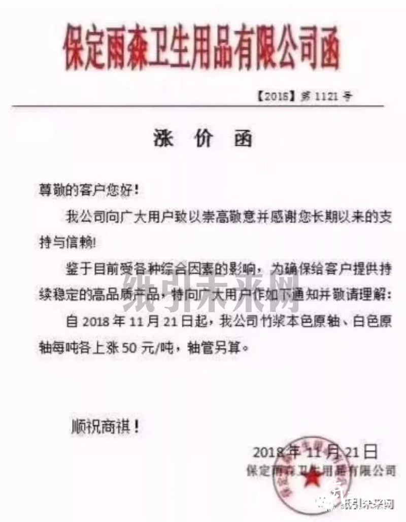 保定雨森衛(wèi)生用品有限公司:鑒于目前受各種綜合因素的影響,自11月21日起,我司竹漿本色原軸、白色原軸每噸各上漲50元/噸,軸管另算。
