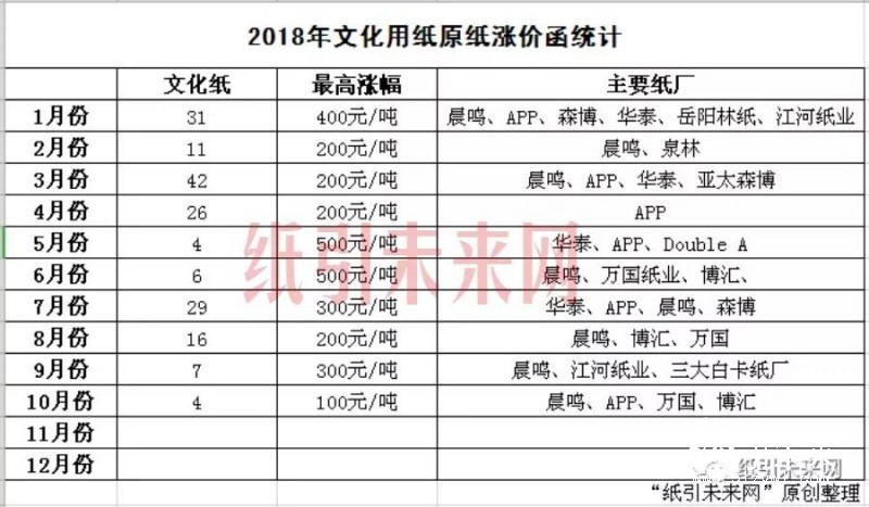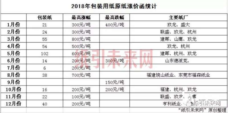 漲價函:據紙引未來網不完全統計,2018年紙廠發布文化紙原紙漲價函176張,包裝紙原紙漲價函392張,總共累計568張,相較2017年的漲價函1636份,少了將近3倍。