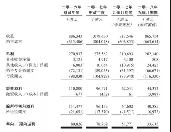 2017年,雋思集團營收同比增長21.8%至10.8億港元,但凈利潤卻同比下降12.3%至7880萬港元。2018年前9個月,雋思集團營收同比增長5.9%至8.66億港元,凈利潤卻同比下降34.6%,為3340萬港元。