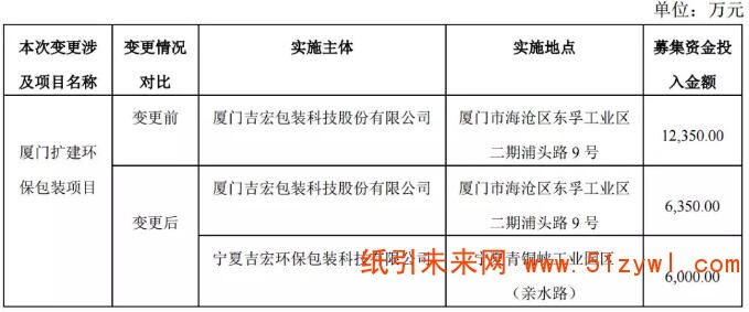 紙引未來網訊 廈門吉宏包裝科技股份有限公司于2019年7月2日審議通過《關于部分募投項目變更實施主體和實施地點的議案》。現根據公司的長遠發展規劃及客戶的實際供貨需求,擬變更“廈門擴建環保包裝項目”部分募集資金6000萬元投入至公司位于全資子公司寧夏吉宏使用。本次募投項目變更實施主體和實施地點后,可填補公司包裝業務生產基地在西北地區的區域空白,完善包裝業務的基地布局。