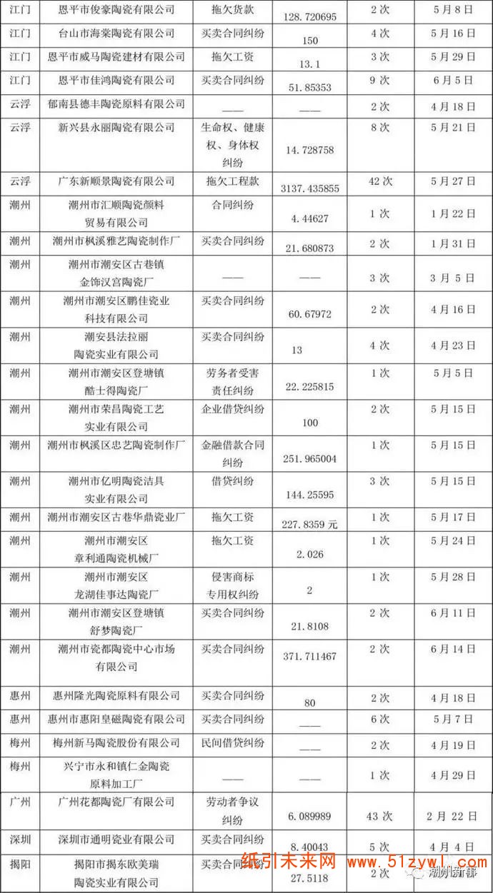 在廣東,建陶業的情況也很不樂觀。據公開資料不完全統計發現,近半年廣東省共有65家陶企被列為失信企業,其中陶瓷制造企業52家,陶瓷機械設備、原料及原料加工企業13家。其中,佛山市被列為失信企業的陶企數量最多,共有30家。另外還有潮州市14家,肇慶4家、清遠2家,江門5家,云浮3家,惠州2家,梅州2家,廣州、深圳、揭陽各1家。