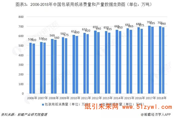 2018年包裝用紙生產(chǎn)量690萬噸,較上年增長-0.72%;消費(fèi)量701萬噸,較上年增長-0.85%。2009~2018年生產(chǎn)量年均增長率2.05%,消費(fèi)量年均增長率1.99%。