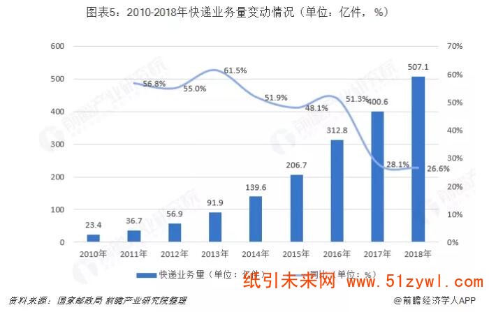 2018年,我國快遞服務(wù)企業(yè)業(yè)務(wù)量達(dá)到507.1億件,同比增長26.6%。快遞業(yè)務(wù)增量為106.5億件,快送業(yè)務(wù)量及増量均創(chuàng)歷史新高。我國日均快件處理量達(dá)到1.4億件,最高日處理量達(dá)到4.2億件,同比增長25.7%。2010-2018年,我國快遞業(yè)務(wù)量年均復(fù)合增長率達(dá)46.9%,是同期國內(nèi)生產(chǎn)總值增速的6倍以上,增速居現(xiàn)代服務(wù)業(yè)前列,是我國新經(jīng)濟(jì)的代表行業(yè)。我國快遞業(yè)務(wù)量超過美、日、歐發(fā)達(dá)經(jīng)濟(jì)體之和,占全球快遞包裹市場份額的一半以上。我國快遞業(yè)務(wù)量規(guī)模連續(xù)五年穩(wěn)居世第一,成為全球快遞包市場發(fā)展的動(dòng)力源和穩(wěn)定器。