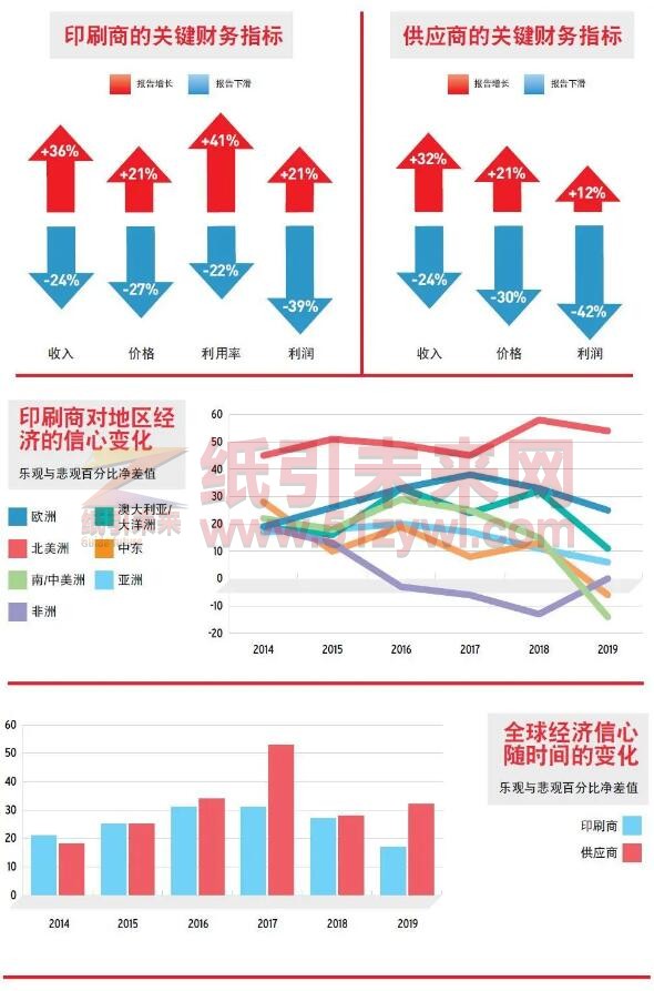調查結果顯示,人們在那時仍保持著樂觀的經濟信心,但態(tài)度明顯更加謹慎。發(fā)達經濟體非常忌憚貿易戰(zhàn)爭所帶來的威脅,新興經濟體則非常擔心腐敗和政治動蕩所造成的影響。雖然環(huán)保減塑活動對有些人來說意味著問題,但是對另一部分人來說卻代表著機遇,因此印刷包裝行業(yè)仍在持續(xù)增長。毫無疑問,從事出版印刷,以及或多或少涉及商業(yè)印刷的人都會對包裝和功能性印刷行業(yè)的增長機遇表示羨慕。