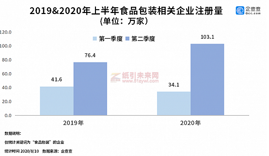 2020年上半年,我國(guó)食品包裝相關(guān)的企業(yè)注冊(cè)量為137.2萬(wàn)家,同比增長(zhǎng)16.3%。其中,二季度注冊(cè)量達(dá)到103.1萬(wàn),環(huán)比上漲202.4%。