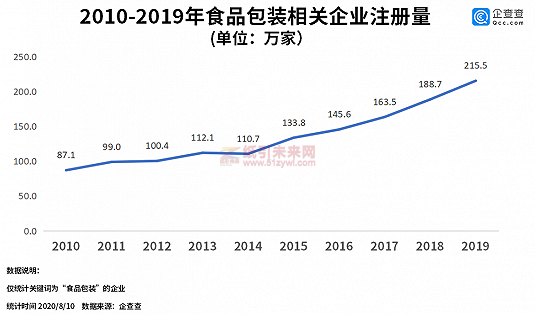 近年來,隨著食品餐飲行業(yè)的發(fā)展,食品包裝和食品包裝紙市場(chǎng)持續(xù)擴(kuò)大。2019年,食品包裝相關(guān)企業(yè)的注冊(cè)量為215.5萬(wàn),同比增長(zhǎng)14.2%。而2010年,相關(guān)企業(yè)注冊(cè)量為87.1萬(wàn)家,10年間年注冊(cè)量增長(zhǎng)1.5倍。