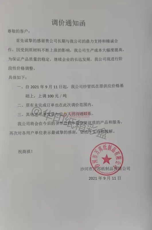 繼8月30日玖龍天津、重慶基地上調白板紙出廠價格50元/噸后,9月8日玖龍東莞、太倉基地上調白板紙出廠價格50元/噸。