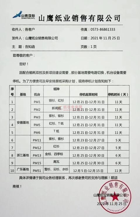 在隨即發(fā)布的停機告知函中,山鷹紙業(yè)宣布三個基地的共10臺紙機都在停產(chǎn)計劃中,停機天數(shù)5-11天不等。