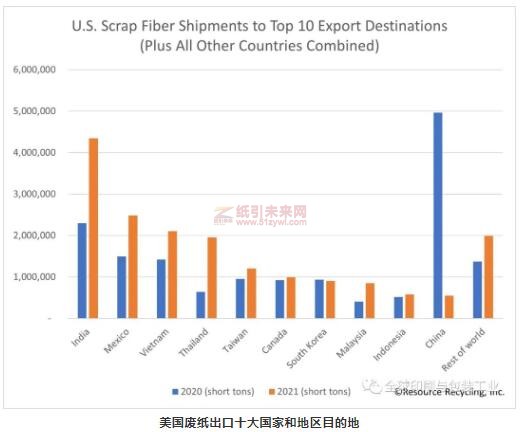 去年在廢紙出口方面,進口美國廢紙的10大國家和地區有較大的變動,更多的廢紙出口到了泰國(增長203%)、馬來西亞(增長109%)、印度(增長89%)、墨西哥(增66%)、越南(增長48%)、中國臺灣(增長26%)、印度尼西亞(增長11%)和加拿大(增長7%)。所有其他國家和地區加起來的廢紙進口增加了45%。