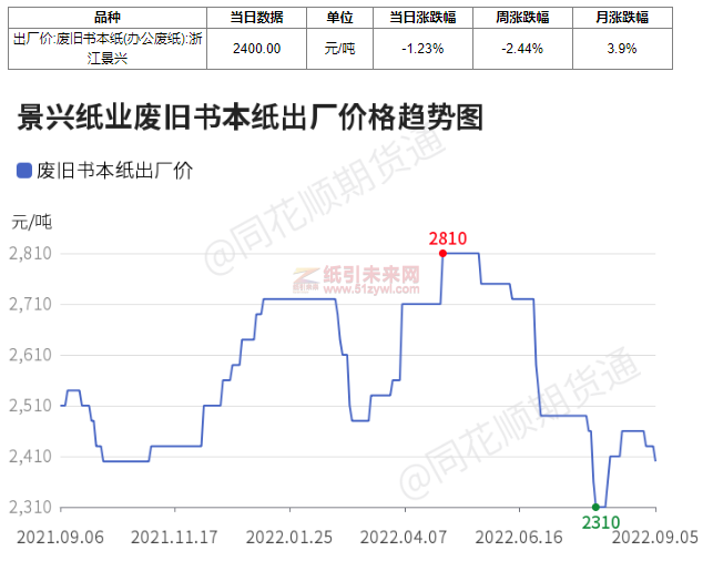 浙江景興廢舊書(shū)本紙9月5日已跌至2400.00元/噸,當(dāng)日跌幅1.23%,周跌幅2.44%,月漲幅3.9%。