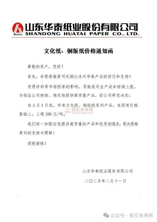 華勁集團:受原材料價格等市場因素影響,為緩解造紙成本壓力,保障正常供貨,經公司審慎考慮決定:2025年3月1日起,所有文化紙在現有的價格基礎上,每噸上調200元。