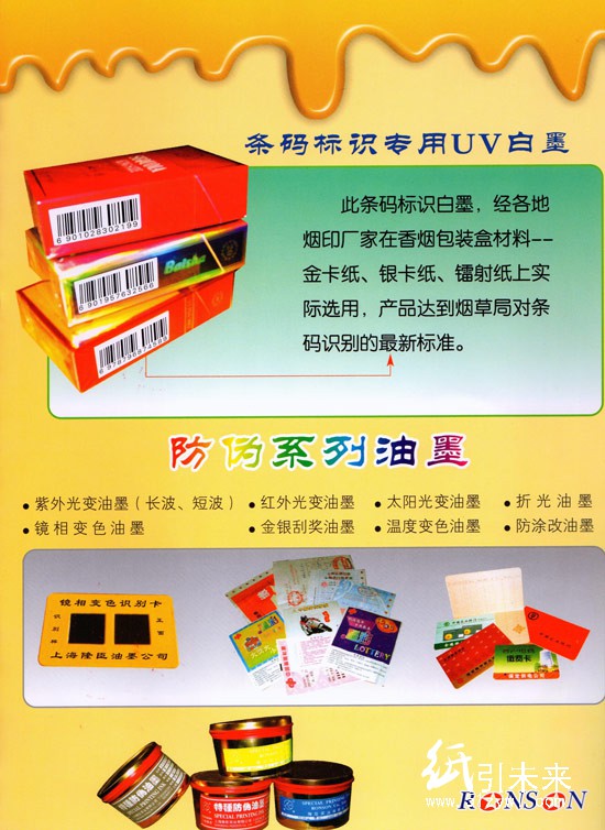 公司擁有先進的生產設備及科學的生產工藝,實施現代化的生產管理及嚴格的質量管理體系,并與上海印刷技術研究所、華東理工大學等科研機構進行長期合作。主要生產特種防偽油墨系列、UV油墨系列及相關材料產品。公司主營:UV膠印油墨,UV(膠印、凹印)光油,UV耐曬油墨,UV啞光油墨,UV燙金光油,多種防偽油墨,紫外線光變油墨(長波、短波),紅外光變油墨,太陽光變油墨,折光油墨,鏡相變色油墨,金銀刮獎油墨,溫變油墨,防涂改油墨,條碼標識墨。