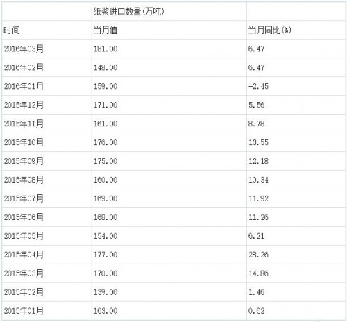 以下為2015年01月至2016年03月我國(guó)紙漿進(jìn)口數(shù)量當(dāng)月值統(tǒng)計(jì):