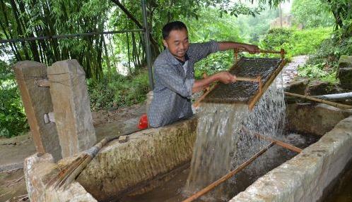 后是制漿。將發(fā)汗后的竹料裝入碾盤內(nèi)碾碎成棉絮狀的纖維,放入專用池子中踩粘柔,進(jìn)一步分裂纖維。再將踩粘柔的纖維放入漿池中,摻入清水,用棍子上下攪拌。待到纖細(xì)均勻的纖維全都浮在水中時,就可以添加黏合劑了。