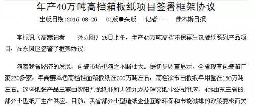 黑龍江佳宏紙業(yè)集團公司、省龍興投資有限公司經(jīng)過廣泛接觸和反復(fù)磋商,26日在東風(fēng)區(qū)政府簽署了年產(chǎn)40萬噸高檔箱板紙項目框架協(xié)議。