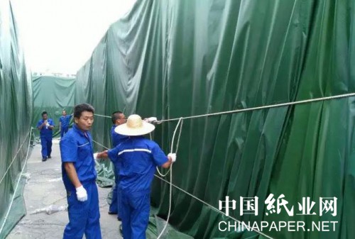 會議后,生產一、二、三部,動力、物流、運管、辦公室等部門立即行動起來:各生產部門立即對本部門管轄區(qū)進行全面細致的檢查,并對存在隱患進行處理。為防止臺風期間出現(xiàn):“降落傘效應”造成鋼結構廠房被掀頂,所以生產部門對外的門、窗以及吊井口,全部被關閉。生產一部、物流部為避免卷簾門無法抵抗臺風,特別對卷簾門進行加固;辦公室組織人員加裝沙包,提供給各部門做防洪圍堰,對各樓頂排水系統(tǒng)進行檢查清理;物流部除使用繩子對室外漿垛進行捆扎外,還另外采取用集裝箱、加水化工桶加壓等辦法,防止?jié){垛在臺風期間被吹開,對各倉庫大門進行加固處理。運管部對各大門堆積沙包并準備了應急水泵,防止暴雨期間,廠外的洪水倒灌進公司;對辦公樓各玻璃門進行加固處理。