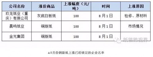 但愿七月流火,8月的高溫也不是高溫。8月份第一份鎖定的紙價上升的企業名單中顯示,所面對的不僅是箱板紙、瓦楞紙、以及白板紙等紙種,而且銅版紙上調的時間序列之中。其中玖龍因為年度檢修以及原材料上漲的原因、晨鳴是因為市場情況的幅度將每噸紙的價格上調100元。8月1日三家企業同時提上,步伐整齊一致。