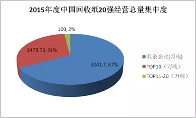 2015年中國廢紙回收總量為4820萬噸,20強企業經營總量為1578萬噸,占全國總量33%,其中前10強企業經營總量為1478萬噸,占全 國總量的31%,產業集中度非常高。2015年中國廢紙總產值約603.46億元,20強企業經營總值為386.79億元,占全國總產值36%,其中前 10強企業經營總值為205.36億元,占全國總產值的34%。