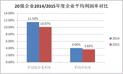 2015年,前20強企業平均綜合毛利率為10.07%,同比下降12.4%,平均凈利率為3.66%,同比下降9.8%,低于行業平均利潤水平。